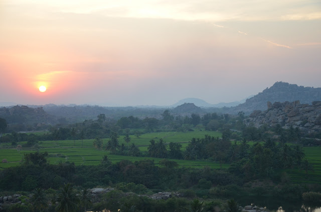 The temple is on the top of a hill so it had really nice views over Hampi. And of course more monkeys. Jason liked this monkey family. It's pretty cute how the other monkey holds its arm around the other one and the bald baby monkeys are jumping around.